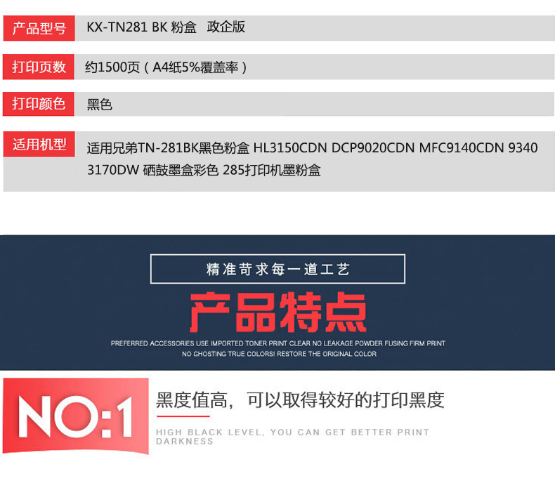 凱欣KX-TN281BK 適用兄弟TN-281BK黑色粉盒 HL3150CDN DCP9020CDN MFC9140CDN 硒鼓墨盒彩色 全國統(tǒng)一價:268元